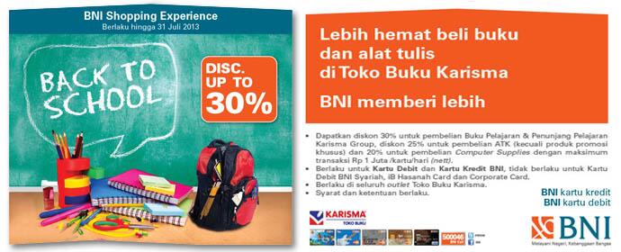 -Dapalkan diskon 30% untuk pembelian Buku Pelajaran & Penunjang Pelajaran Karisma Group, diskon 25% untuk pembelian ATK (kecuali produk promosi khusus) dan 20% untuk pembelian Computer Supplies dengan maksimum tansaksi Rp 1 Juta/kartu/hari (nett).